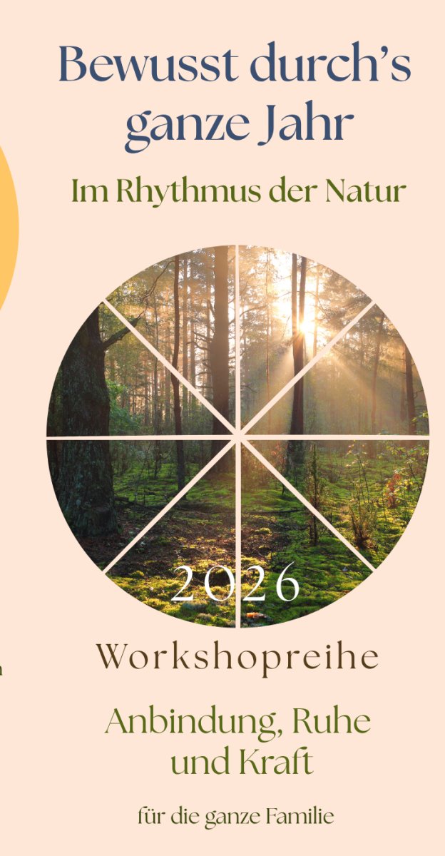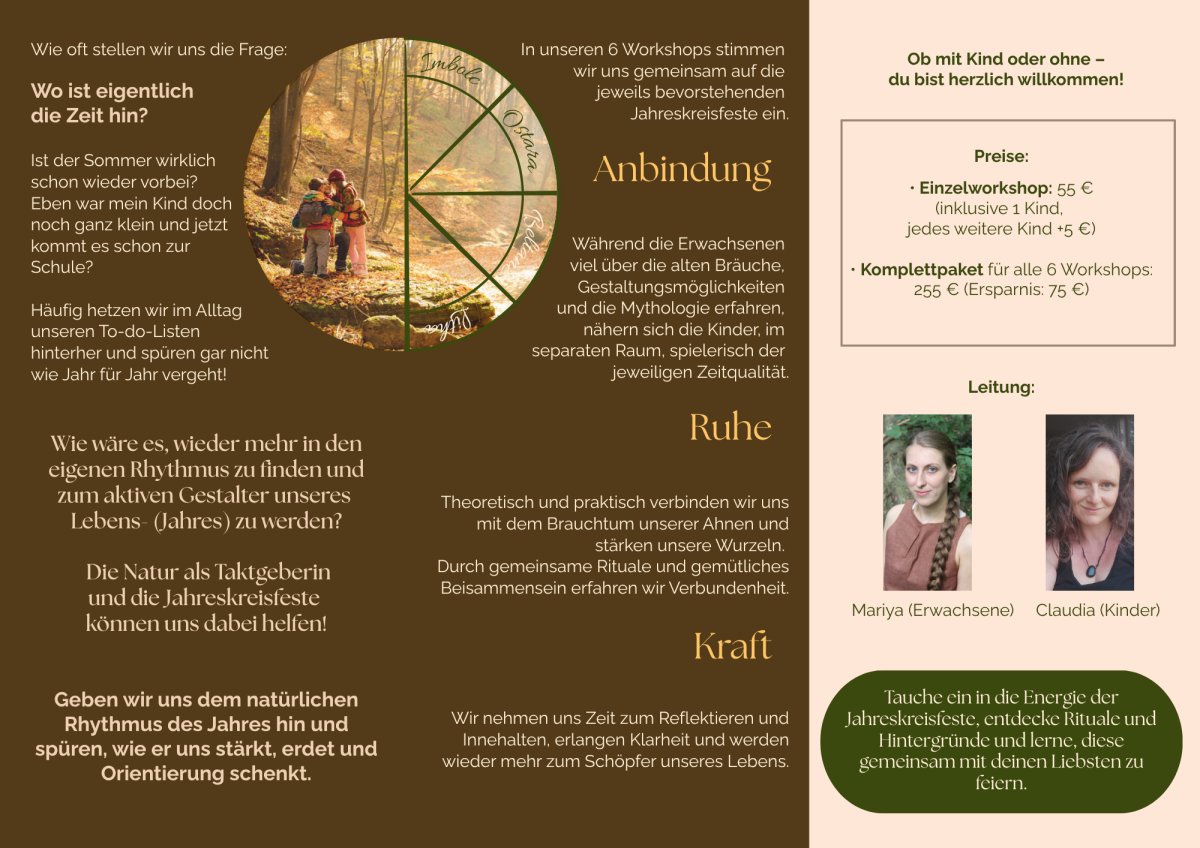 | Workshop-Termine: 25. Januar 15. März 26. April 13. September 25. Oktober 13. Dezember Immer sonntags vor dem jeweiligen Jahreskreisfest– Von 15:00 – 17:30 Uhr Höhepunkt: Gemeinsames Sommerfest zur Sommersonnenwende am 20. Juni (nicht Teil der Workshop-Reihe, jeder ist Willkommen!) |